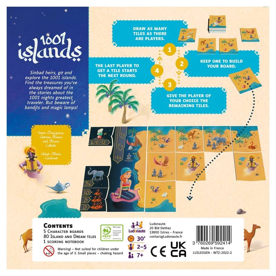As children of Sinbad, you have set yourselves a new challenge to explore the 1001 islands and find the treasures of your father, the great sailor. 1001 Islands is a tile-drafting game in which you score points by matching your dream tiles and your island tiles as best as possible. A game takes 16 rounds, with each player adding one tile to their personal board to build their island or collect dream tiles, then players tally their points.