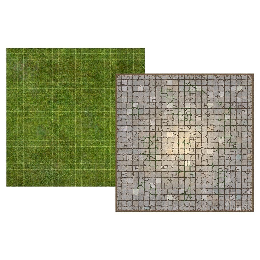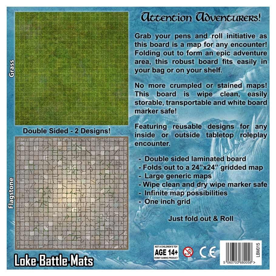 Double sided laminated board with folds out to create a 24”x24” gridded map. Large generic maps to accommodate any encounter. Can be drawn on with ANY non-permanent marker (including dry wipe). Allows GMs and DMs infinite map possibilities in a handy format. 1” grid allows adventurers to plan and track encounters with miniatures. Double sided, grass and flagstone designs. Just fold out & roll.