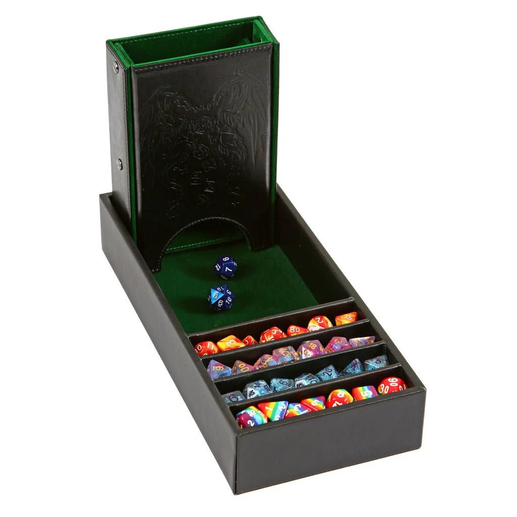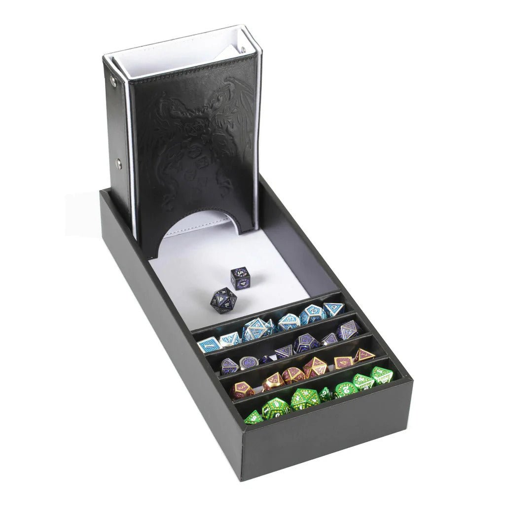 - MULTI USE: 3 in 1 Dice Tray, Dice Storage, and Dice Tower for Dungeons and Dragons Tabletop Game. Lid can also be used as another dice tray. Dice Tower folds up for easy travel for an all in one , rolling tray, dice tower and dice storage solution