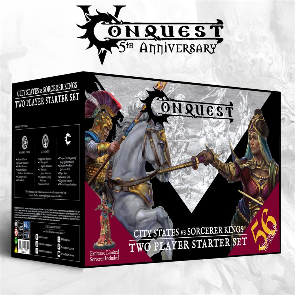 Grab a friend and dive into the world of Conquest: With proposed scenarios designed to ease you into the system of Conquest, the box contains a starter warband and a commander unit for each faction - Sorcerer Kings, our 8th and newest faction vs the Greek Army of the City States! These City States figures will take you back in time, with the highly detailed sculpting that ancient Greece is famous for. The Sorcerer Kings are a highly sculpted group of Wizards and Sorcerers who operate in the mysticism of the east. The set is ready for two players to clash on game tables. Play a rank and flank style of game with the Last Argument of Kings or the Skirmish style of play with the First Blood rule set, 2 copies of each quick start guides are included. You'll also find 2 paper Maps of the worlds of Ea, 2 Wood Conquest Measuring Tools, all the Command Cards, Bases and Stands needed for play, and a Path of Conquest guide for each faction showing you the future of play as you advance your skills. This is a complete 2 player set and a wonderful introduction to the world of Conquest.