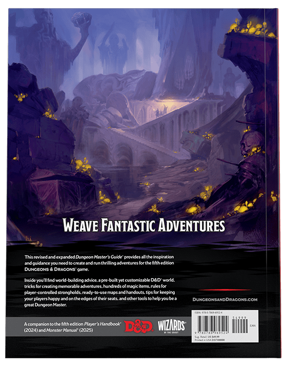 Create thrilling adventures with this revised and expanded Dungeon Master’s Guide for fifth edition Dungeons & Dragons®. Inside this essential guide is everything new and experienced Dungeon Masters need to weave epic tales, build fantastical worlds, and inspire memorable moments for your party.