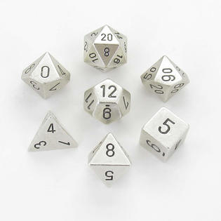 A 7-count set of metal dice. Set includes: 4-sided (d4), 6-sided w/numbers (d6), 8-sided (d8), 10-sided (d10 numbered 0-9), Tens 10 (10-sided die numbered 00-90), 12-sided (d12) and 20-sided (d20).