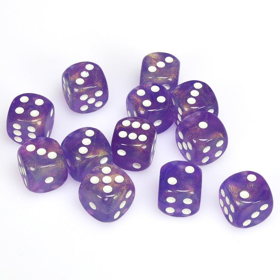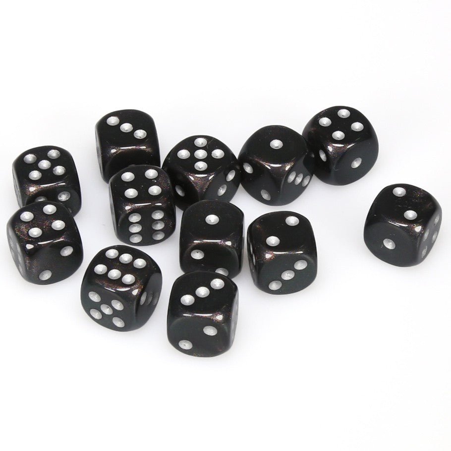 This set of Chessex dice includes twelve dice of the same color and style. These 16mm (5/8 inch) dice are standard-sized for role-playing or board-gaming.