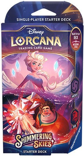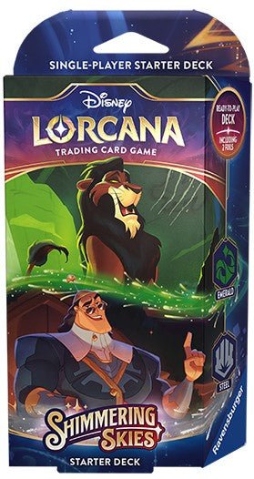 Two starter decks are available for the Disney Lorcana TCG set Shimmering Skies. Each prebuilt deck has 60 cards and features cards from two inks, each with distinct play styles. The two ink combinations are Amethyst & Ruby and Emerald & Steel. Each starter deck also includes a booster pack of 12 cards to start your collection.