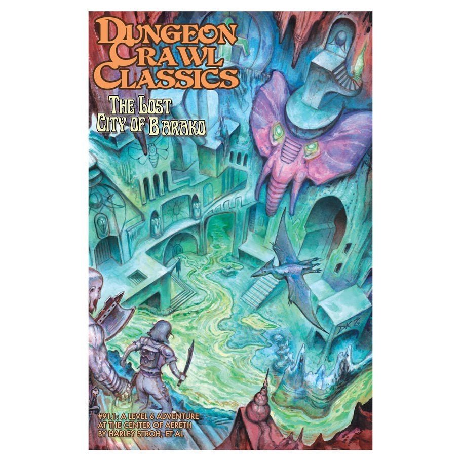 A level 7 adventure at the center of Aereth. The pleasure palace of Barako rises above the Bleak Shores atop enormous stone pylons. The palace arches towards the cavernous gloom, lit by a thousand lanterns fueled by the rendered flesh of a thousand lamenting souls. Within the city, hellish figures dart and whirl in the flickering light, prostrating themselves before their Aghartan masters, all to the cacophonic beat of a thousand alien instruments. What adventures will you find here? Made in the USA.