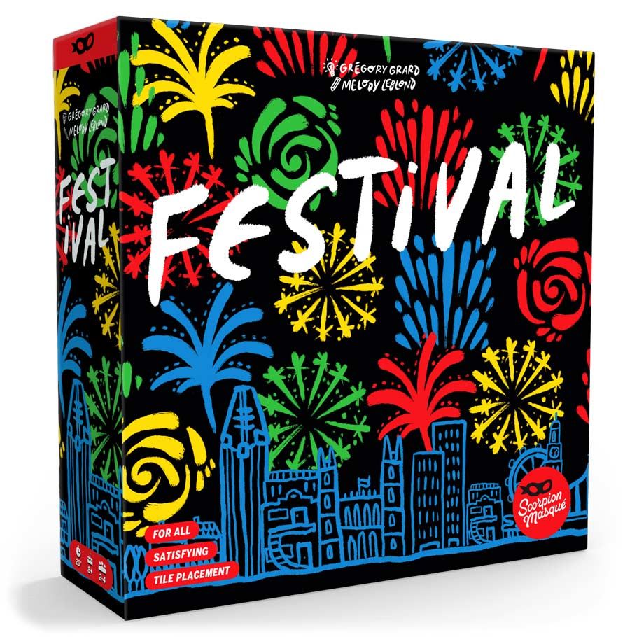 In Festival, players are tasked with coordinating the most spectacular fireworks display for their respective city. They will attempt to achieve a grand display by placing a Fireworks tiles on their turn or choosing an objective to complete. Players that achieve their objectives and stack their tile as high as possible will earn maximum points and help send their city to the top of the competitive fireworks display leaderboard.