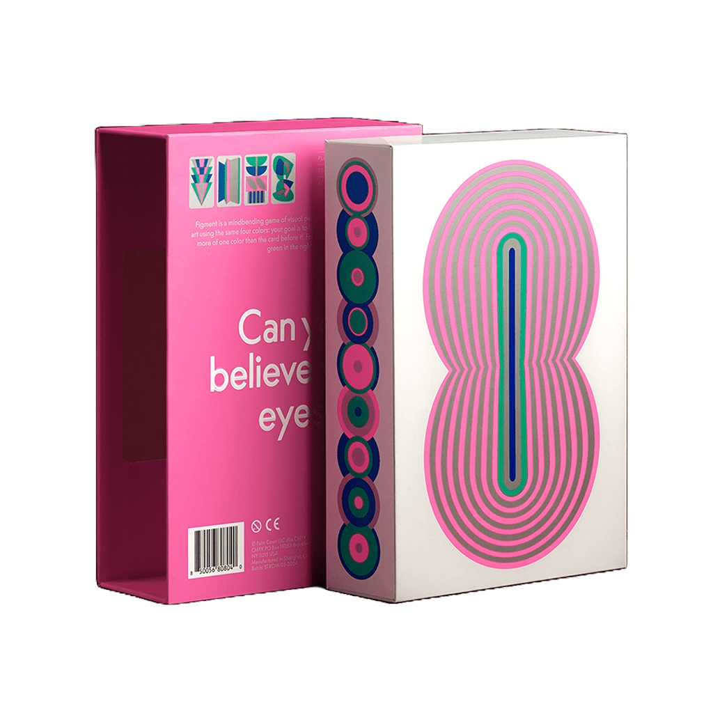 Figment is a mindbending game of visual perception. Each card features unique art using the same four colors: your goal is to line them up in a row so each card has more of one color than the card before it. For the cards above, is the amount of green in the order?