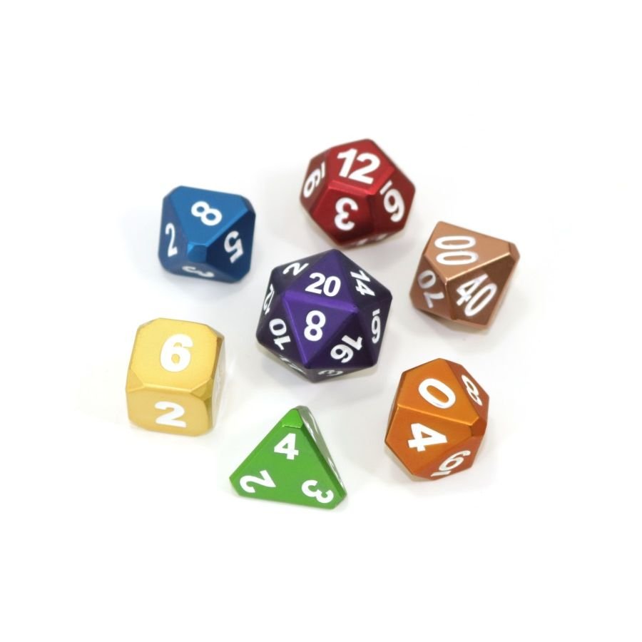 This is a rainbow mix set that has one of each of our frosted metal dice. The specific colors are randomized for each set.
