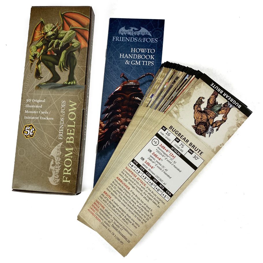 50 spectacularly-illustrated DnD monsters on dry erase friendly stat cards. Just fold them over the DM screen or prop up on the table for easy reference and tracking initiative. “From Below” contains our own creations for 5e DnD – including new kinds of hobgoblins and goblins, undead, drow, terrifying creatures from below, and many more. Surprise and challenge even the most veteran players with these unique creatures!