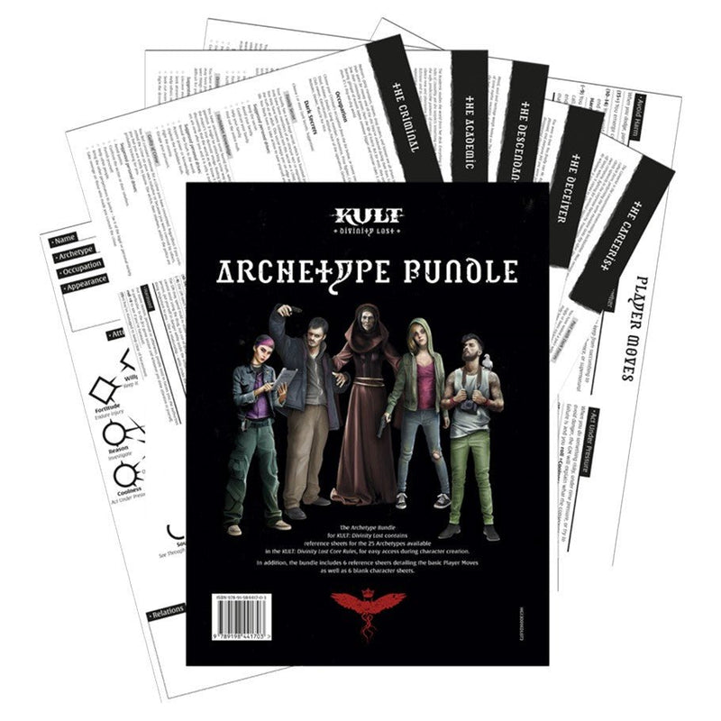 The Archetype Bundle for KULT: Divinity Lost contains reference sheets for the 25 Archetypes available in the KULT: Divinity Lost Core Rules, for easy access during character creation. In addition, the bundle includes 6 reference sheets detailing the basic Player Moves as well as 6 blank character sheets. In KULT: DIVINITY LOST, the world around us is a lie. Mankind is trapped in an Illusion. We do not see the great citadels of Metropolis towering over our highest skyscrapers. We do not hear the screams from the forgotten cellar where hidden stairs take us to Inferno. We do not smell the blood and burnt flesh from those sacrificed to long forgotten Gods. But some of us see glimpses from beyond the veil. We have this strange feeling that something is not right—the ramblings of a madman in the subway seems to carry a hidden message, and, when thinking about it, our reclusive neighbor doesn’t appear to be completely human when we pass in the hallway. By slowly discovering the truth about our prison, our captors, and our hidden pasts, we can finally awaken from our induced sleep and take control of our destiny.