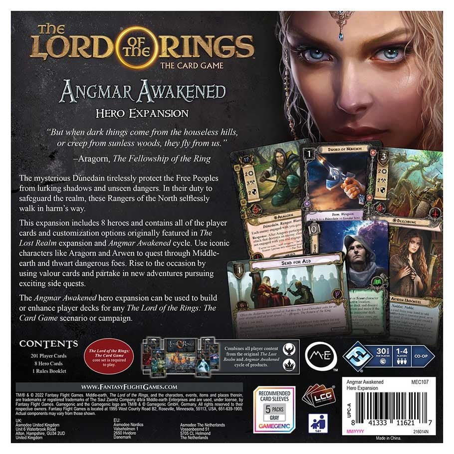 The Angmar Awakened Hero Expansion includes 8 heroes for The Lord of the Rings: The Card Game, as well as all of the player cards and customization options featured in The Lost Realm and the original Angmar Awakened cycle. Use iconic characters like Aragorn and Arwen to quest through Middle-earth and thwart dangerous foes. Rise to the occasion by using valor cards and partake in new adventures pursuing thrilling side quests.