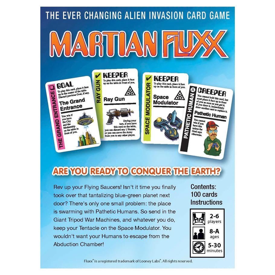 Are you ready to conquer the earth? Martian Fluxx is a classic monster story in ever-changing card game form. It's an Invasion from the Planet Mars! The players are the Martians determined to destroy the Pathetic Humans who are keeping them from winning. It's got Flying Saucers, Giant Tripod War Machines, Tentacles, Ray Guns, a Mothership, and of course, a Space Modulator. Be careful - you don't want your Humans escaping from the Abduction Chamber!