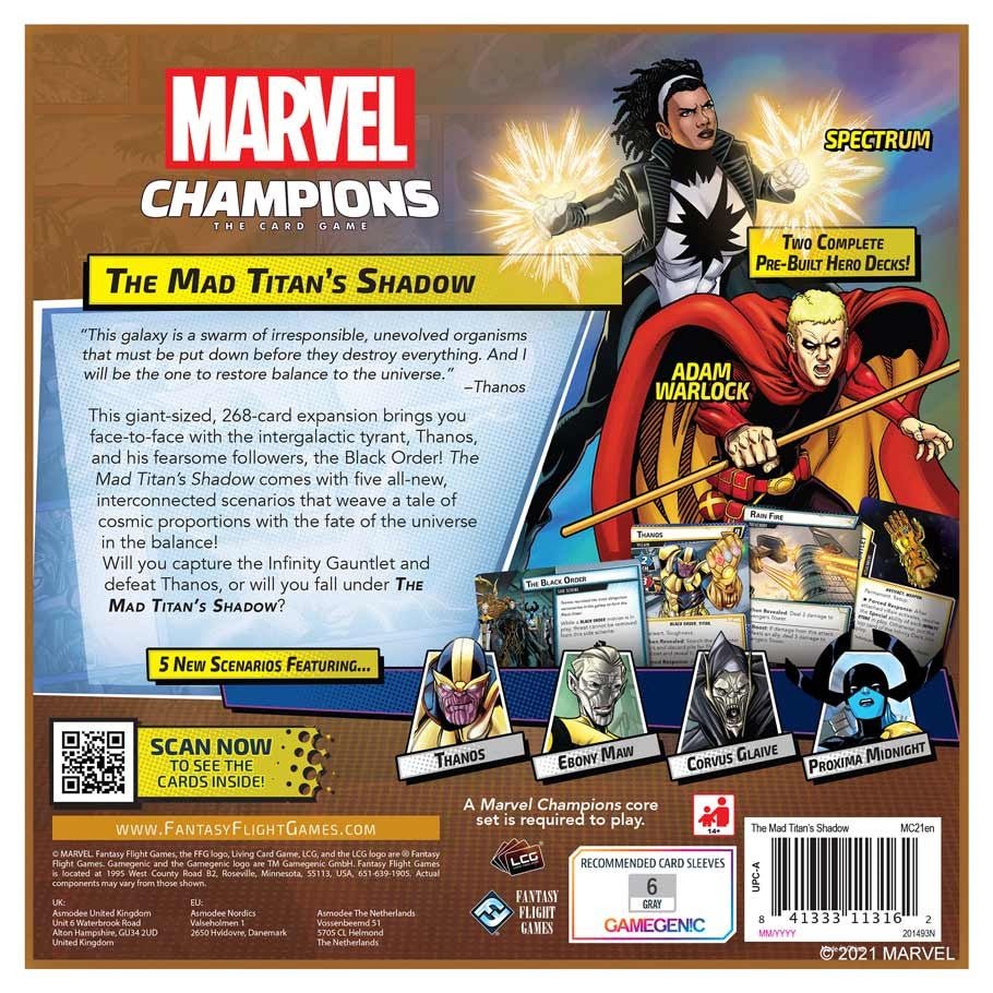 The Mad Titan’s Shadow campaign expansion boasts a massive infusion of new content for players’ games of Marvel Champions. Spectrum and Adam Warlock join the players’ roster of heroes with fully pre-built and ready-to-play player decks stuffed with new cards. Whether players are using these new heroes or relying on old favorites, players can test their mettle in five new scenarios: Ebony Maw, Proxima Midnight and Corvus Glaive, Thanos, Hela, and Loki. Each of these five scenarios offers a unique challenge, and while players can simply choose a villain to battle, this campaign expansion lives up to its name with a brand-new cinematic campaign for Marvel Champions: The Card Game.