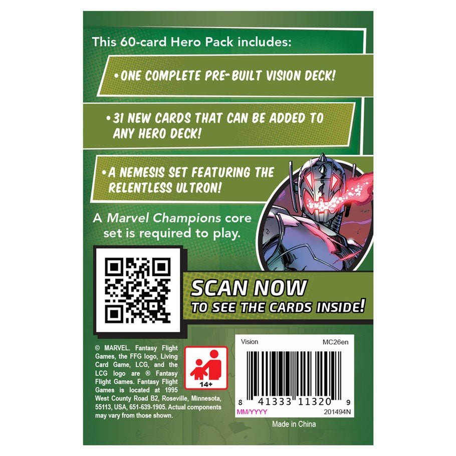 Orginially created by Ultron to destroy the Avengers, the android known as Vision joined the ranks of Earth’s mightiest heroes instead. Now he uses his incredible powers to protect the planet from danger as The Vision—and he’s phasing into players’ games of Marvel Champions: The Card Game. By manipulating his own mass to become dense or intangible, Vision can defeat any opponent. Within this Hero Pack, players will find Vision, his sixteen signature cards, and a full assortment of Protection cards inviting players to safeguard their friends.