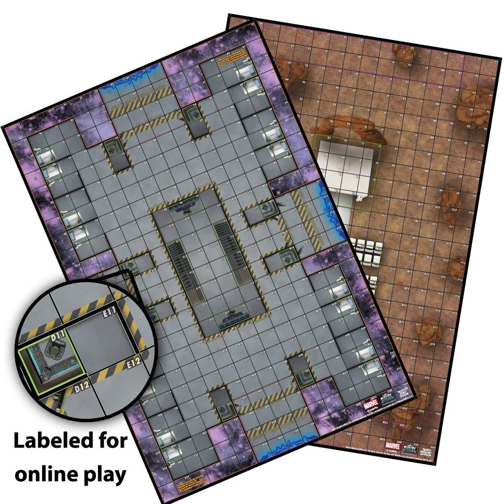 This kit also comes with a double-sided map that has each square individually labeled to make it easier to play HeroClix remotely. If both players have the same map from the Play at Home kit, they can have their own set up and follow along while playing.