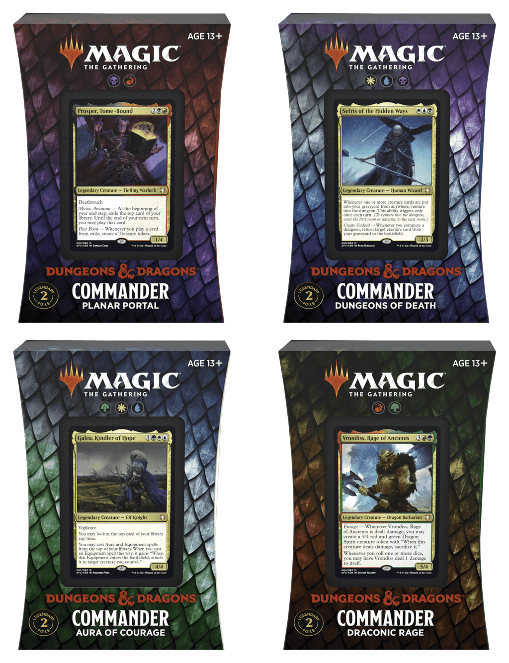 Contains 1 deck each, 4 total, of the new Adventures in Forgotten Realms Commander Decks.