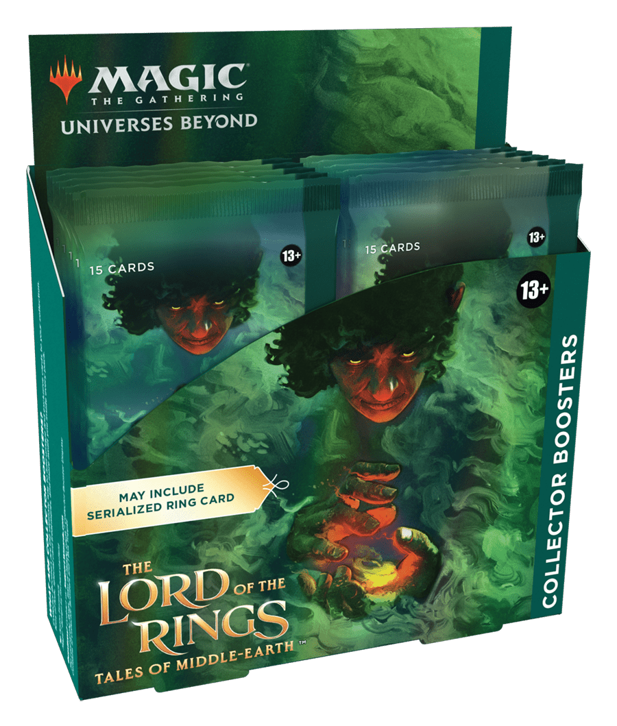 - Contents—12 The Lord of the Rings: Tales of Middle-earth Collector Boosters, with 15 MTG cards in each pack + 1 Traditional Foil Box Topper card