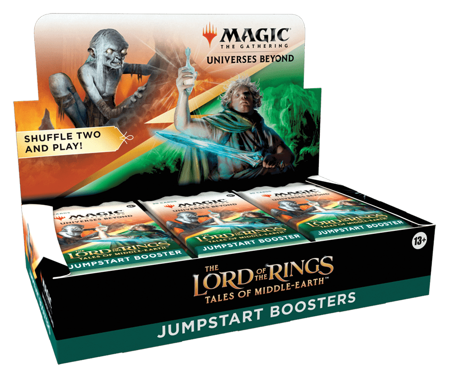 The Lord of the Rings: Tales of Middle-earth Jumpstart Booster Box contains 18 The Lord of the Rings: Tales of Middle-earth Jumpstart Boosters. Each booster has a theme. Just grab two packs and shuffle them together for wild combos and a unique gameplay experience that’s great for a quick game, for long-time fans looking to jump back in, or for a fun way to learn to play.