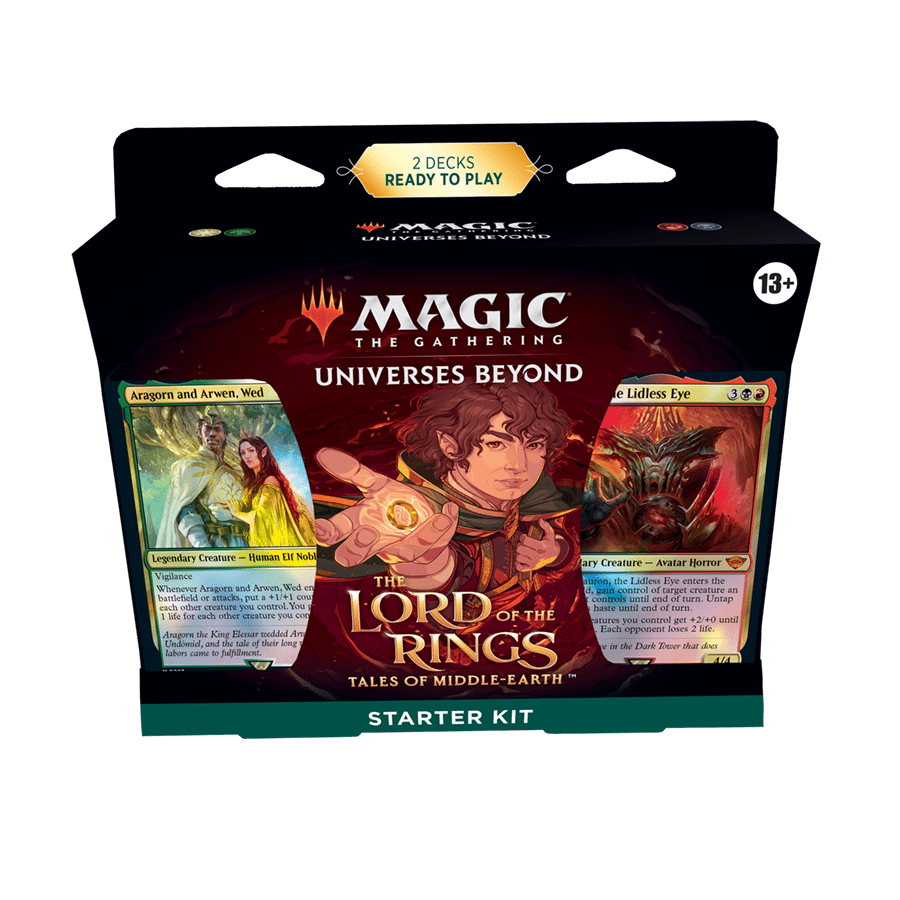 The Lord of the Rings: Tales of Middle-earth Starter Kit contains 2 ready-to-play 60-card decks (Lands included), 4 double-sided tokens (2 with each deck), 2 deck boxes, 1 how-to-play guide booklet, 2 double-sided reference cards (Turn Order/Attacking & Blocking), and 2 code cards for two people to unlock both decks and play online in Magic: The Gathering Arena, a digital platform available on desktop and on the mobile app.