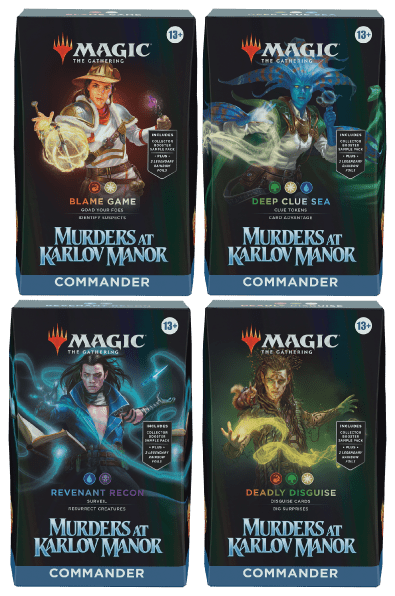 In Commander, four players come together to show their strength and strategy, with one player coming out on top. Each 100-card ready-to-play Murders at Karlov Manor Commander Deck makes it easy for Commander fans in your store to grab a deck and play right away.