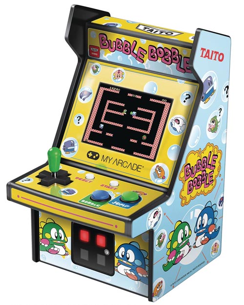The Bubble Bobble Micro Player is one of many collectible mini arcade machines by My Arcade. The My Arcade Micro Players are premium 6.75 inch miniature arcade cabinets that feature high quality artwork inspired by the original arcade machines. They are boxed in collectible packaging that can be displayed in homes and offices. Micro Players feature 2.75 inch full color displays, removable joysticks, external speakers with volume controls, and headphone jacks.