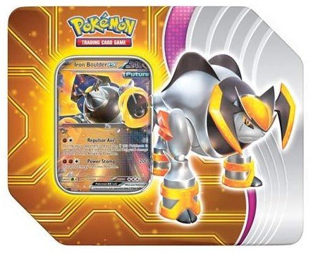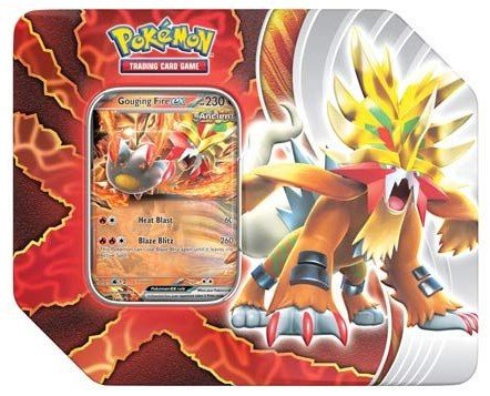 More Paradox Pokémon from the past and future arrive in the Pokémon TCG for a destined battle surpassing time itself! The Ancient Pokémon Gouging Fire ex and Raging Bolt ex show their primordial prowess, while the Future Pokémon Iron Boulder ex and Iron Crown ex demonstrate metallic mastery. In this Paradox Destinies Tin, you’ll find a promo card featuring one of these four Paradox Pokémon, additional allies to add to the fray with 5 booster packs, and a code card for Pokémon TCG Live.