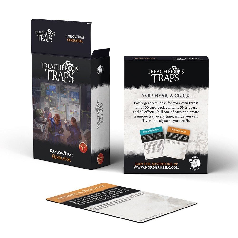 Endless Possibilities. Easily generate ideas for your own traps! This 100 card deck contains 50 triggers and 50 effects. Pull one of each and create a unique trap every time, which you can flavor and adjust as you see fit.
