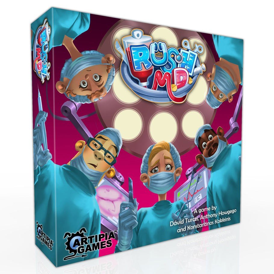 'Rush M.D. is an innovative, real-time, cooperative board game that simulates the challenging and high-pressure nature of medical professions. A worker placement mechanism, using hourglasses as workers allows, but also limits, players to perform a multitude of actions. Each player handles 1 Doctor hourglass running around the hospital, admitting patients, providing immediate medical care, performing different kinds of exams as well as performing surgeries. Additionally, there are 4 more Nurse hourglasses, which can be used by all players. Nurses provide medicines to patients, supply all necessary drugs and equipment that you need to carry out all your exams and medical procedures. Any worker placed on an action space may not be used elsewhere before the sand within the hourglass runs out, making each decision important as time is limited.