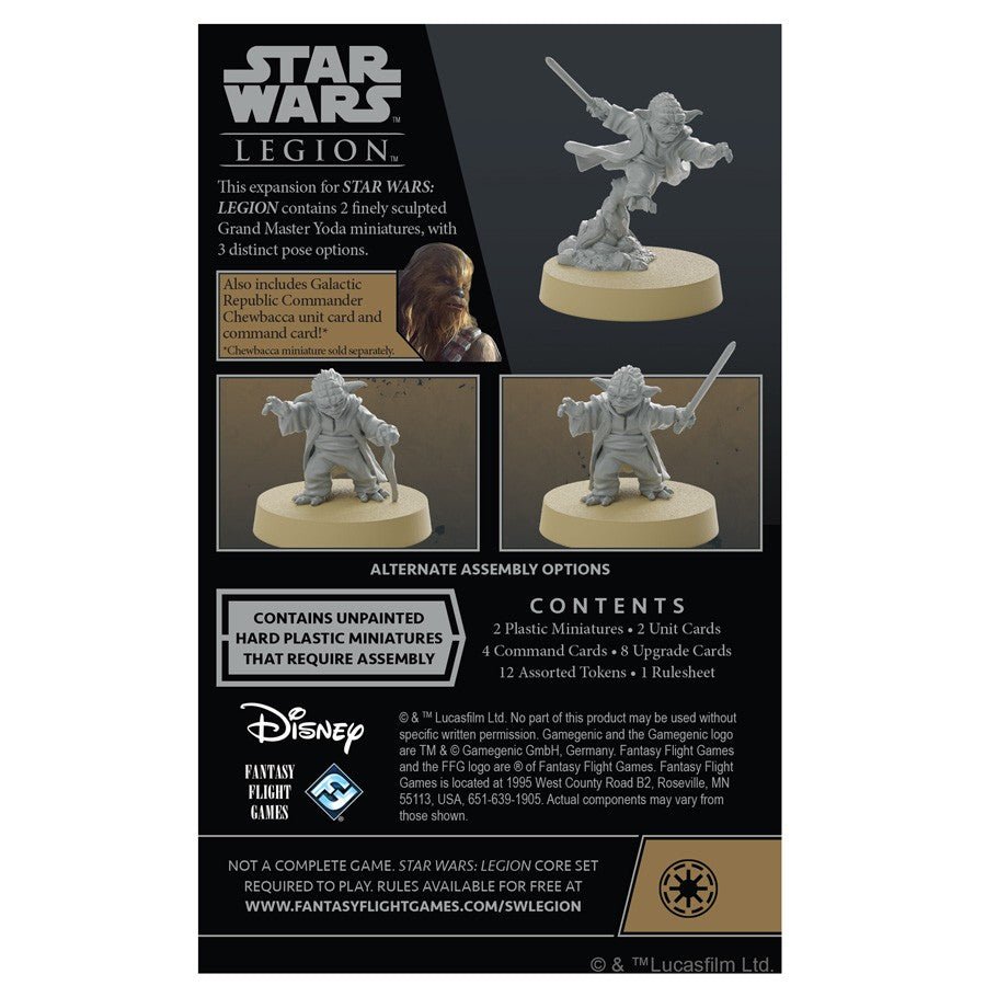 This expansion adds this legendary Jedi to your Star Wars: Legion collection, beginning with two beautifully detailed, unpainted Grand Master Yoda miniatures that can be assembled in a variety of poses, such as leaping into battle or concentrating while reaching out with the Force. All of Yoda’s skills, including his deep connection to the Force, are laid out on a unit card and his three signature command cards. These substantial powers can be further augmented by eight upgrade cards that grant him new Force powers and ways to command your armies. Finally, this expansion also includes a Republic unit card and an additional command card for the mighty Wookiee Chewbacca, allowing you to use your existing miniature in this faction.