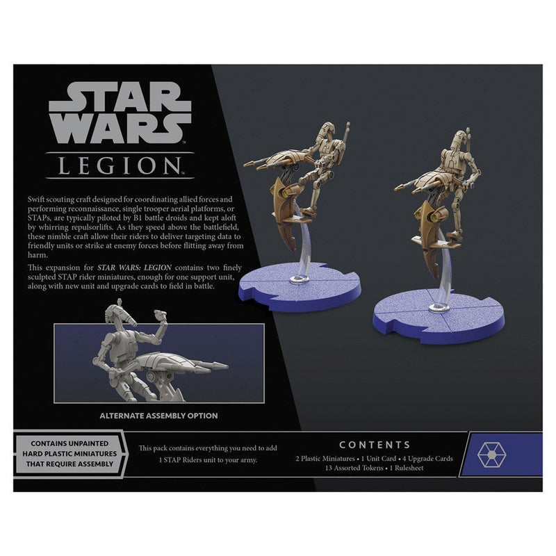 Within the STAP Riders Unit Expansion, you’ll find two beautifully detailed, unpainted STAP rider miniatures that featuring a number of customization options. Two different flight stands let you depict them at different heights, while the STAP pilots themselves can be assembled in a variety of poses. Finally, four upgrade cards invite you to equip them with comms systems to more fully integrate your STAP riders into your army.