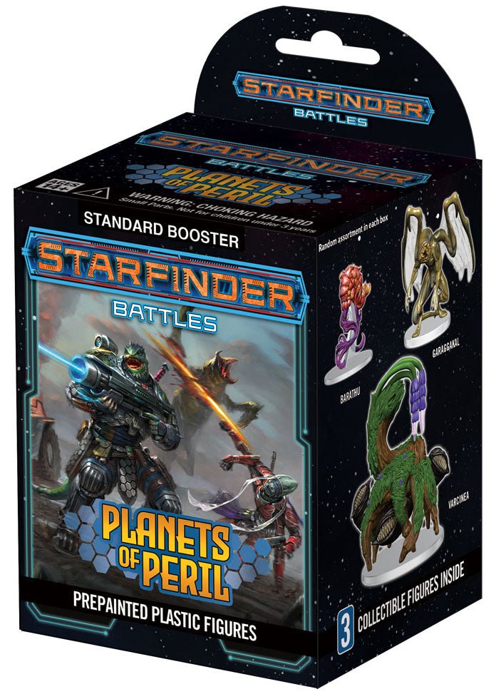 Blast off into a galaxy of adventure with Starfinder Battles: Planets of Peril! Step into your powered armor and grab your magic-infused laser rifle as you investigate the mysteries of a weird universe with your bold starship crew. Will you delve for lost artifacts in the ruins of alien temples? Strap on rune-enhanced armor and a laser rifle to battle undead empires in fleets of bone ships, or defend colonists from a swarm of ravenous monsters? Maybe you`ll hack into the mainframe of a god-run corporation, or search the stars for clues to the secret history of the universe or brand new planets to explore. Planets of Peril is a set of 32 all new Starfinder Battles minis for play with the Starfinder Battles Role Playing Game.
