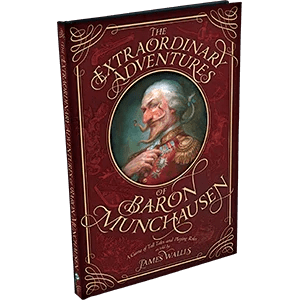 The Extraordinary Adventures of Baron Munchausen requires no GM or preparation, and plays in under an hour, using a unique RPG core that replaces dice and pencils with money and fine wines. Originally released in 1998, it was the first of the New Style games and jumpstarted the story game revolution of the early 2000s. Now acclaimed as a modern classic, we are proud to place it back before the unwashed masses, in the fervent hope that one or two of them may harbour enough of a faint spark of intellect to buy it and appreciate its erudition, wit, chivalry, and insults against politicians, lawyers, other charlatans, and the inhabitants of various nations but principally the French.