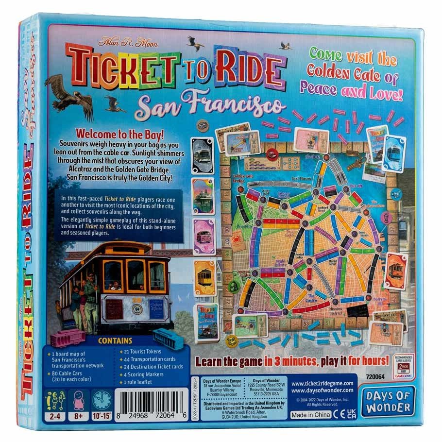 Enjoy a nice walk along the Embarcadero and hop on an old cable car for a ride toward Fisherman's Wharf. Soon, the Golden Gate Bridge will rise in front of you... Welcome to the City by the Bay! Continuing the successful series of the City games, Ticket to Ride San Francisco embarks players in a fun and fast visit of one the world most popular city.