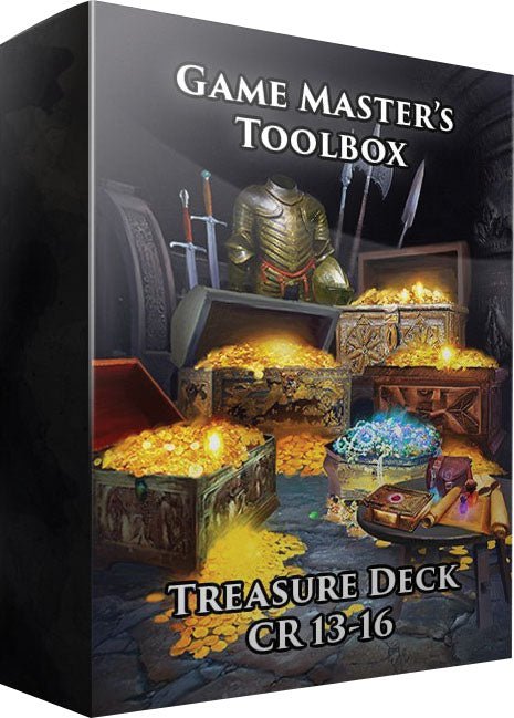 This addition to the Game Master's Toolbox is designed to bring magical and non-magical items from 5th edition out of the Player's Handbook and DMG, and to put them into your hands! Optimize your top role playing games today with the Treasure Deck CR 13-16. The deck includes: Five decks in total (4 of 5), 52 card deck, Deck includes up to very-rare wealth, gems, weapons, armor, and more. Each card has 4 outcomes, all determined by a d12 roll.
