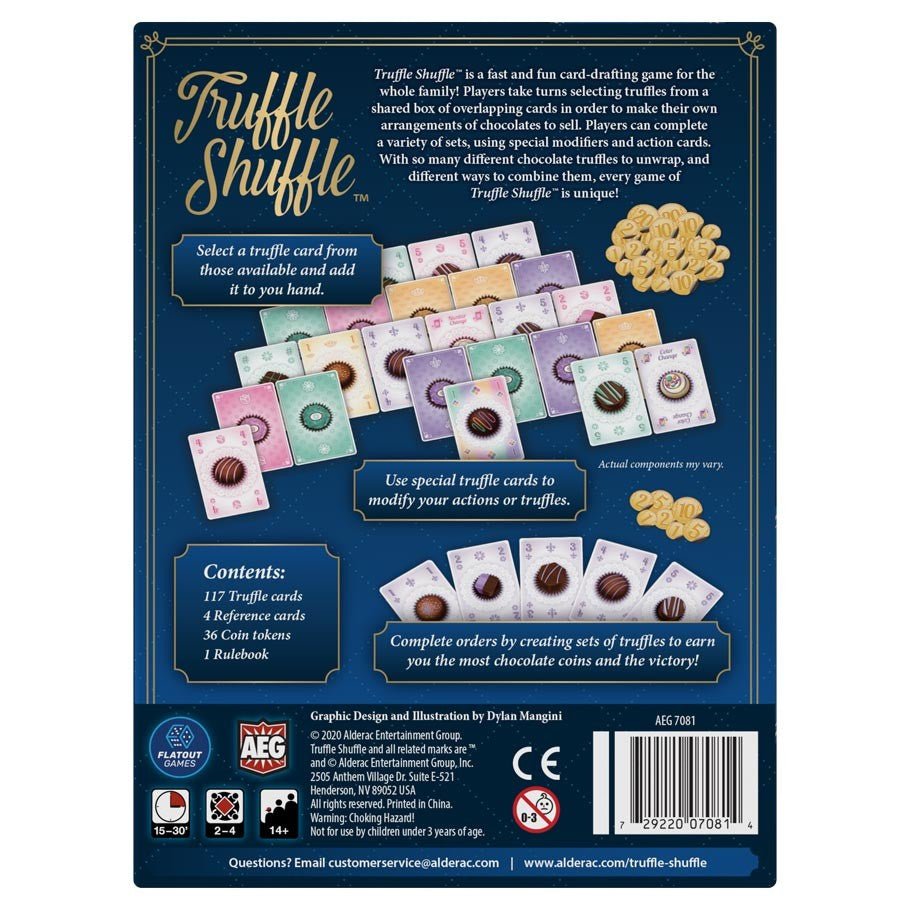 Truffle Shuffle™ is a fast and fun card-drafting game for the whole family! Players take turns selecting truffles from a shared box of overlapping cards in order to make their own arrangements of chocolates to sell. Players can complete a variety of sets, using special modifiers and action cards. With so many different chocolate truffles to unwrap, and different ways to combine them, every game of Truffle Shuffle™ is unique!