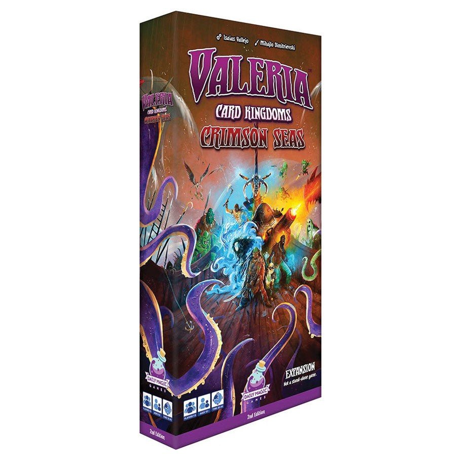 In Crimson Seas, you will obtain Maps to new far-off lands beyond the borders of Valeria allowing you to import trade Goods from Araby to increase your victory points, purchase Tomes of great power to augment your resource production, rescue captured Nobles from the villainous Amarynth Empire, and plunder the wealth of the Cursed Isle. Beware the monsters of the sea, though, as they increase in strength, sowing chaos throughout all of Valeria.