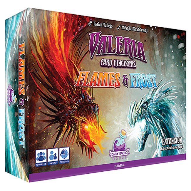 The Kingdom of Valeria is expanding to the fiery peaks of volcanoes, and the cold ridges of glacial mountains! Valeria: Card Kingdoms – Flames & Frost brings in a whole new set of Citizens, Monsters, Domains, and Dukes that you can play by replacing or mixing with components from the base game, for all new experiences!