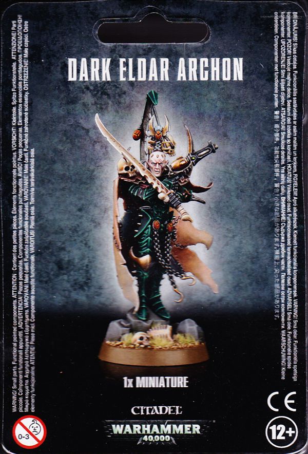 This 11-piece plastic kit makes one Archon clad in Kabalite armour inscribed with runes. The Archon carries a husk blade and splinter pistol, while the cloak of skin and the trophy rack mounted upon his pack proudly display the bounty of horror he has reaped in battle.